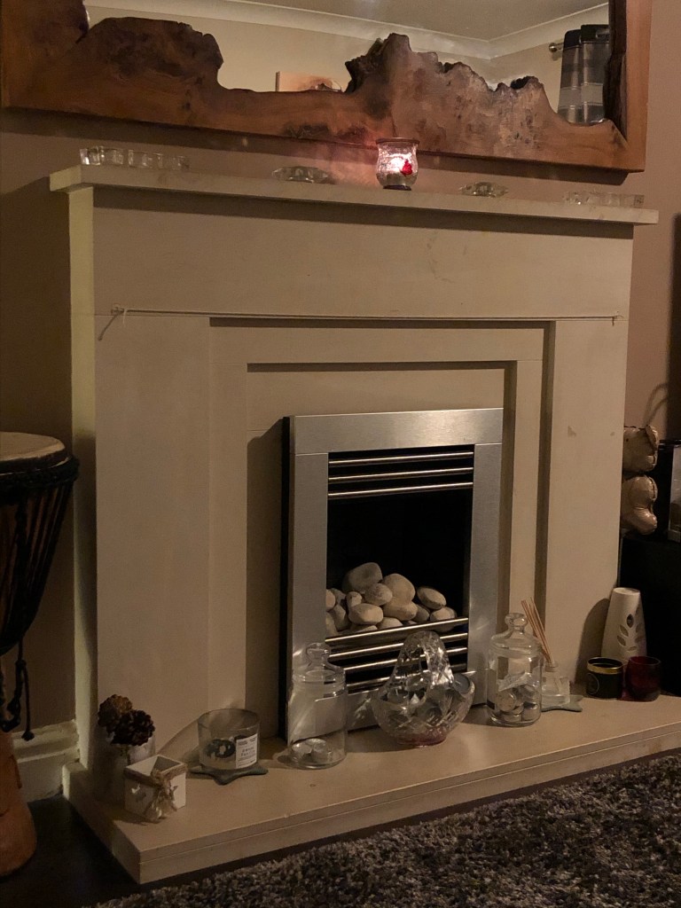 Just before my lovely friend came round to give me a massage this morning, I spent 10 mins tidying up the fireplace and mantlepiece. Also gave the room a quick once over with the duster and vacuum cleaner.
