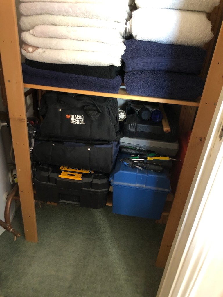 Our airing cupboard hasn’t got a lot of shelving, and for some reason it has items in there that probably aren’t in other people’s airing cupboards. There are tools and toolboxes hanging around at the bottom somewhere, and a whole bunch old sheets and towels… in case anyone needs to do some painting or we have to mop up some water…
