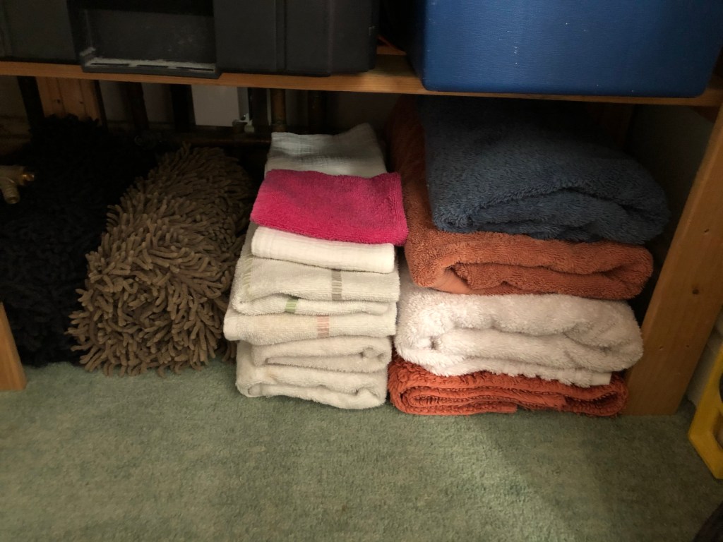 This obviously left limited space for towels we actually use. Not sure when painting will next occur in this house, so I decided to take the whole plastic basket out thereby freeing up one shelf; however, I wanted to put the old towels back somewhere.