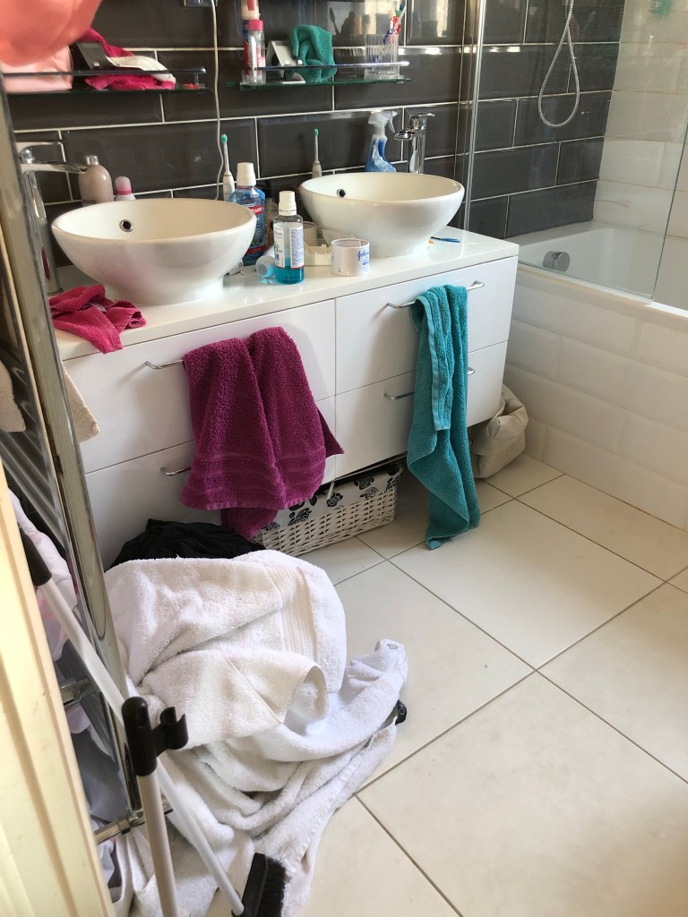 It doesn’t take long to clear and clean one area. Faced with this mess in the main bathroom today…