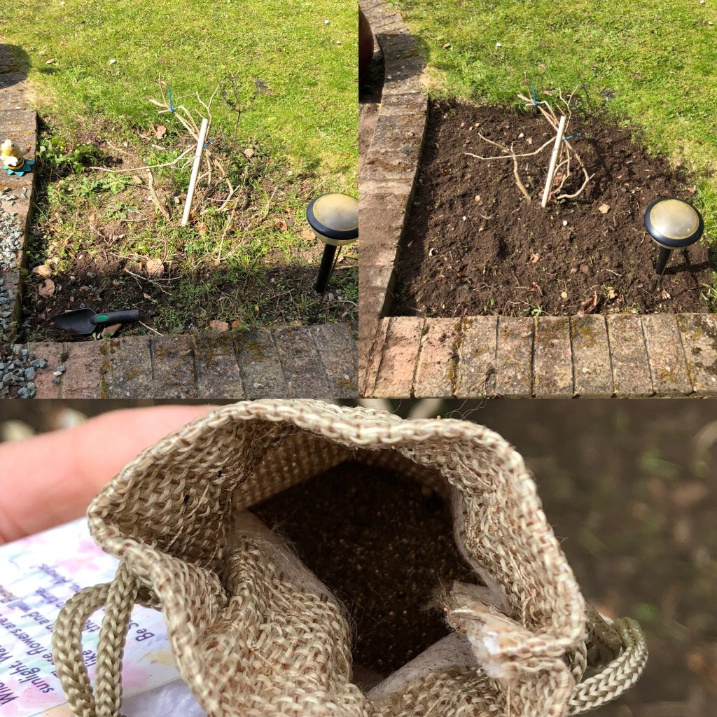 … and then just like the instructions said, I lightly raked the seeds into the soil. It didn’t take long either – it was a pleasant way to spend my lunch break. That plant in the middle is actually alive; it has new shoots growing. I can’t remember what it’s called. The wildflowers should grow all around it.