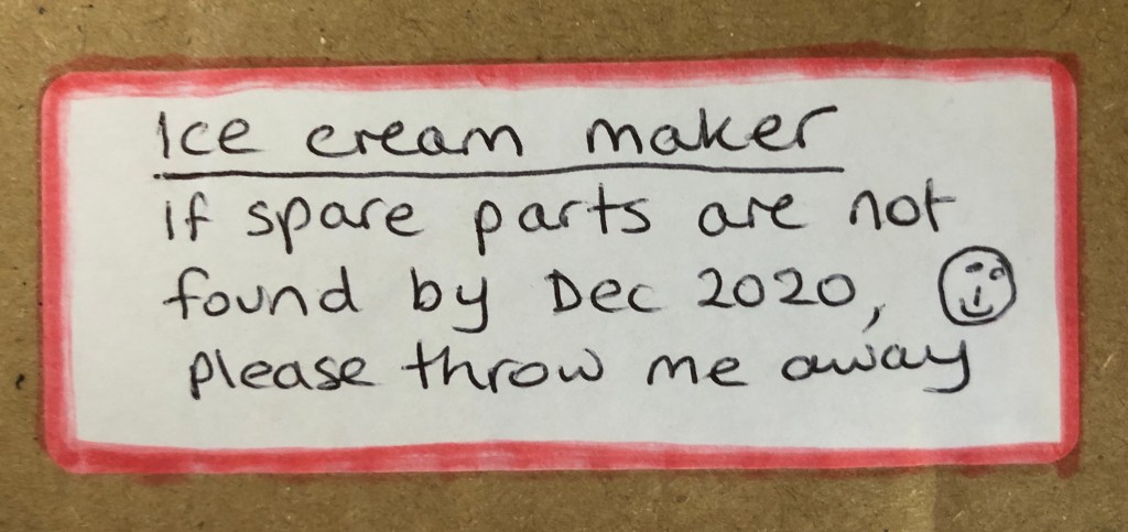 The ice cream maker (in the carrier bag) is missing its lid. I have no idea if the missing part is in the house or garage. I don’t remember ever using it – my husband may have made ice-cream with it a couple of times when the girls were small. I’m going to put it in a box in the garage with a label saying ‘if spare parts are not found by Dec 2020, please throw me away!