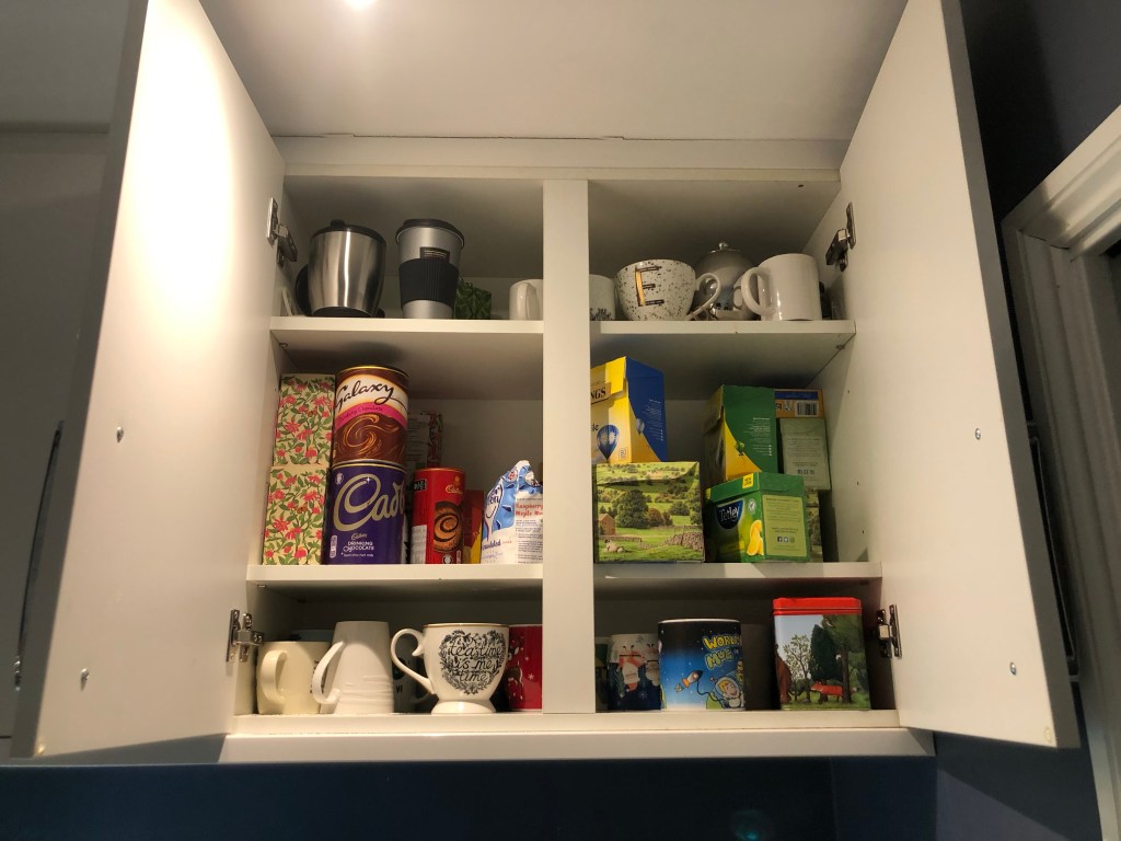 So, as part of my daily decluttering challenge, I decided to give the cupboard a bit of love and attention. Here’s the ‘before’ photo.