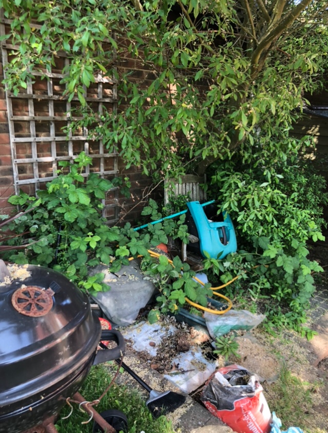 There were garden toys from when the girls were small, a bag of sand where the bag was disintegrated, an old wooden chair with part of the tree growing through it, weeds (some with thorns.. ouch), a fire pit, a grass container from an old lawn mower and general rubbish. The bonus finds were a bag of potting compost, pots and plastic troughs.