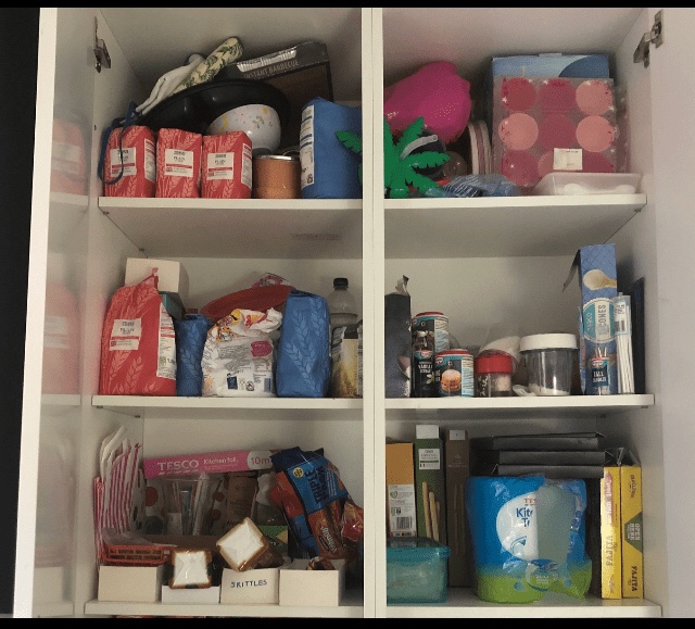 Last week’s mass kitchen decluttering left a lot of surface clutter including items with no home. It finally got to me today and I had to take action. I sorted out some of the remaining cupboards – the top three shelves of the food cupboard (below) and a corner one that I haven’t quite finished yet.