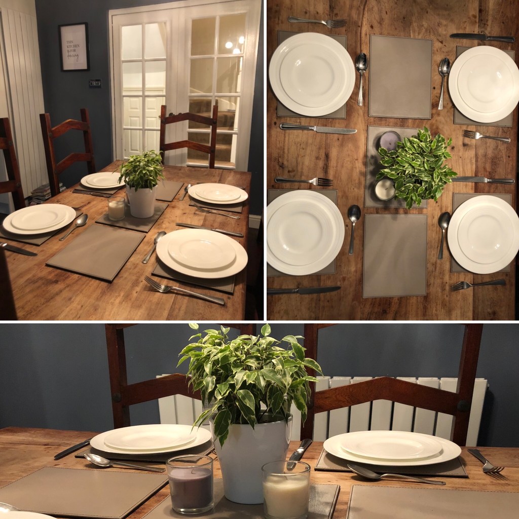 After we decluttered, my daughter had an idea how to make the table look nicer and suggested putting some decoration in the centre. She then laid the table to show me how different our dining room could look. She put a plant that was on the breakfast bar in a different pot and we picked up a few candles whilst we were at the supermarket this evening. We were really happy with the final result.