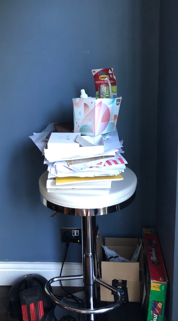 This got me looking at the remaining clutter lying around including this clutter castle in the corner and the mess on the dining room table.