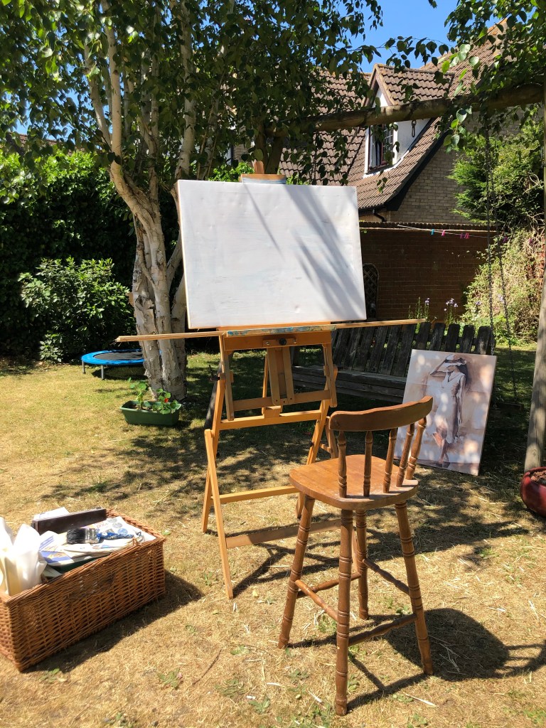 I knew that everything he needed was in the garage, as I’d come across them when sorting things out recently. I got his paints, brushes and easel and helped him set it all up in the garden. He painted over one of the canvases with white paint and left it to dry.