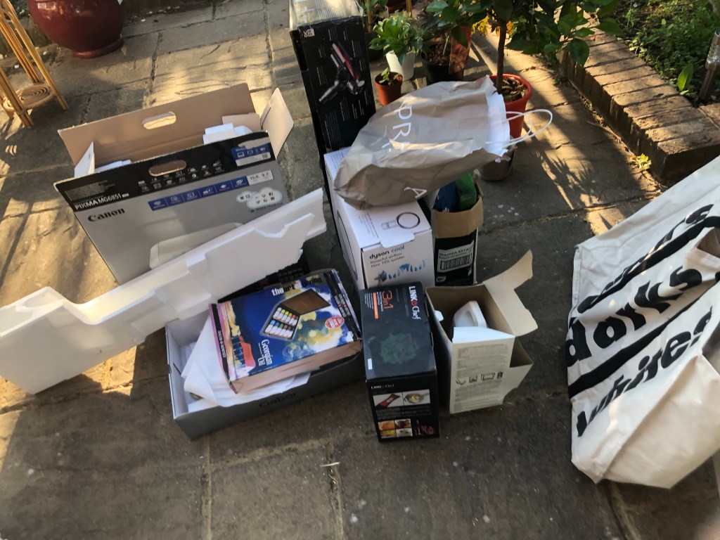 I can’t go into the garage without wanting to tidy something, so mid-afternoon I popped back into my cluttered hideaway for an hour to find things that I could throw away permanently or recycle. I also assumed that my husband wouldn’t want to put the painting stuff back in the garage so I used that space for the many filled charity bags. My daughter came in at the end and said that it was looking tidier in there. The words ‘garage’ and ‘tidy’ have never been used in the same sentence before, so well done me! Here are a few empty boxes and other items that I forced myself to recycle today…