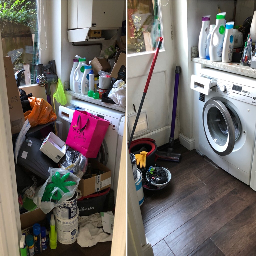 I did really well and by mid-morning, I had gone through quite a bit of stuff. Before and after photos are below (so far) but still have a lot to go through mainly on the surfaces. At least I can get to the washing machine now. It really was hidden away this morning.