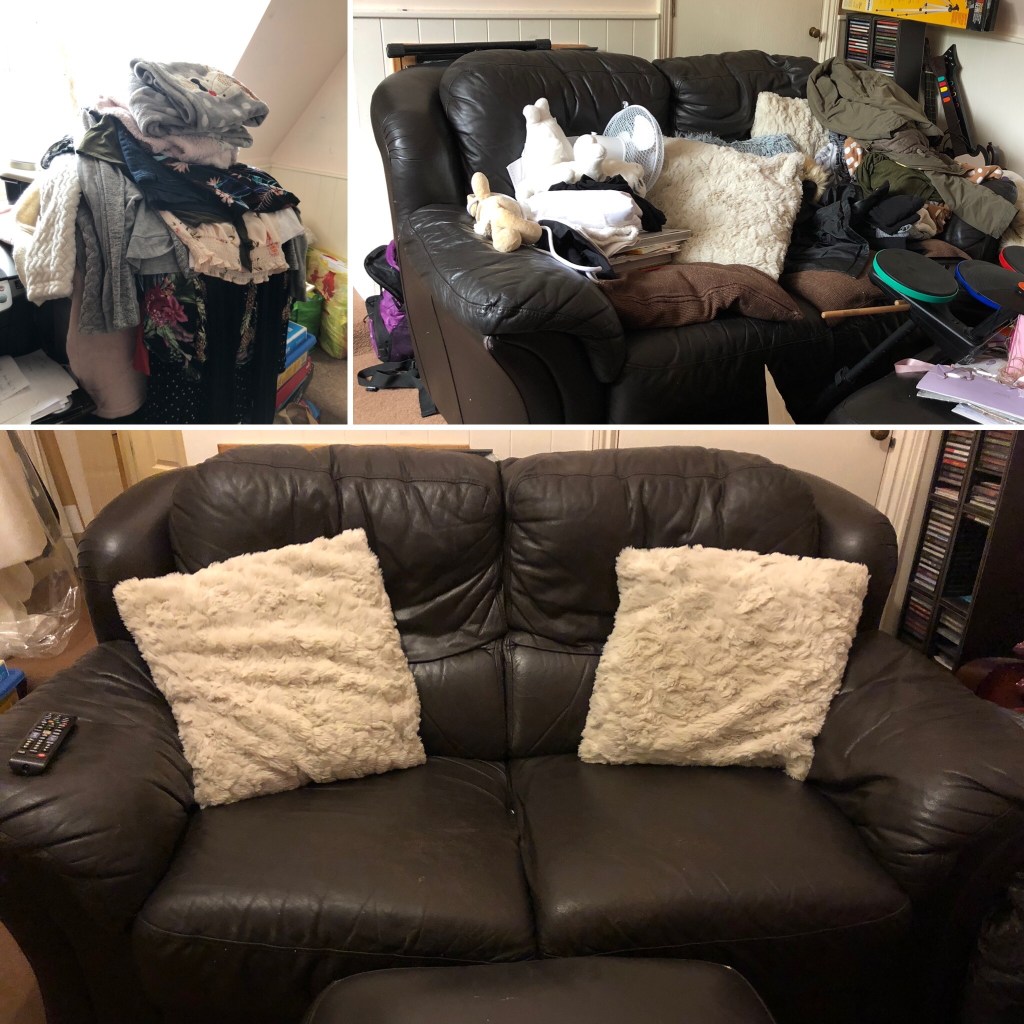 - I removed all of the clothes that were covering the old sofa (mainly clothes that the girls don’t want) and then put them in a pile over the other side of the room. Some went into a charity bag but I didn’t do that to all of them for the following reasons (1) I don’t think that my eldest daughter has asked my youngest daughter if she wants any of the clothes, and (2) I have a friend who I can pass some of the good clothes onto after lockdown