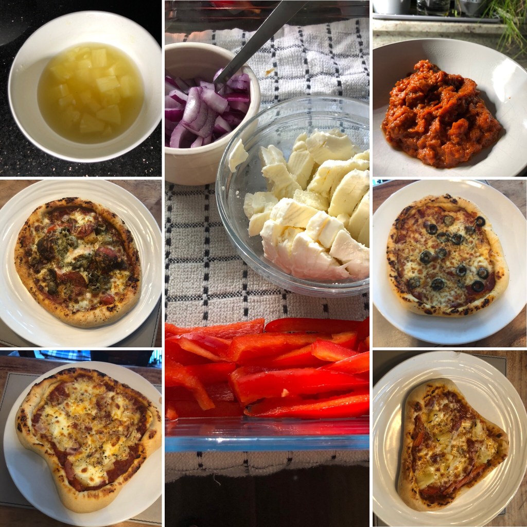 My daughter divided the dough into four and rolled one base out. She then delegated the rest of the rolling and shaping to me whilst she put the toppings on. I didn’t realise that dough was so stretchy; it just springs back when you try and roll it. We made some fun shapes as it wasn’t easy making them round 😀. Then we popped them in the oven for 10-15 minutes.