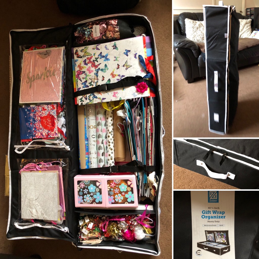 Yesterday, I had everything laid out in the middle of the room in sections hoping that what I purchased would house it all. Unless I got rid of some of it, it had to be a generous size. I had been shocked to count over 60 gift bags which included 22 bottle bags and a few Christmas ones (the rest are with the decorations in the loft… so there’s actually more). This gift wrap organiser exceeded my expectations though with its easy to access accessory pockets and divider. It’s going to make a huge difference when looking for things. I shouldn’t have to buy wrapping paper or gift bags for a while.