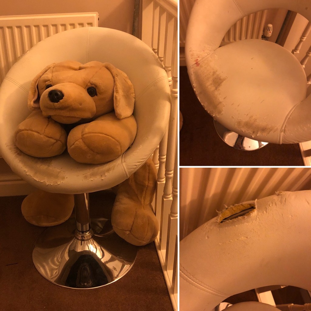 Today we learnt that we really need to get rid of something before it’s completely worn out. My daughter has been telling me for weeks that she needs a new chair for her desk and I kept saying ‘find one you like online and I’ll get it for you’. She couldn’t decide. This afternoon she called me upstairs laughing that she’d nearly fallen through it! She was in the middle of doing homework so I gave her an old chair that I used for my desk when I was her age (and I’m 35 years older than her). OMG I can’t believe that the chair is 35+ years old, and not really used for anything other than dumpling clothes on in our bedroom.