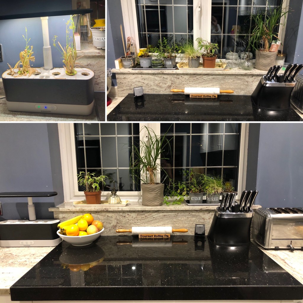 After work, I was determined to clear out the AeroGarden and sort out the herbs on the windowsill, firstly because it’s cluttered and secondly because we are getting little flies around the kitchen. You’ll see from the top two photos how untidy it all looked. The photo at the bottom is how it looks now. It looks and feels so much better and it didn’t take long to clean and wipe everything down.