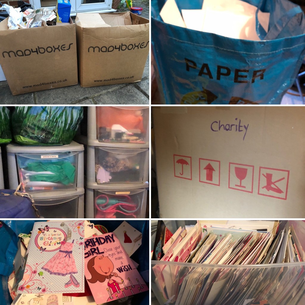 I’m pleased with the progress that I’ve made in the garage today. I went through quite a few boxes and plastic drawers, recycling old cards, unwanted paperwork and cardboard. I also filled three black sacks of rubbish, one large box which I immediately sealed and labeled ‘charity’, and a couple of other boxes and bags for charity. I’ve got a better feel for what’s in the garage now as I got right up to the far wall where there were some very neatly packed boxes. I’ll go through those another day as six hours was enough today.