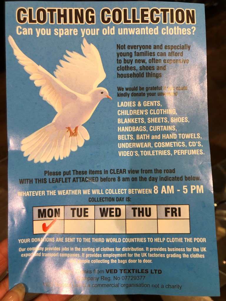 I also couldn’t believe it when two charity bags that I left outside last night got picked up this morning (I should have left more out!). This leaflet came through the door last week and it said collection on Monday.