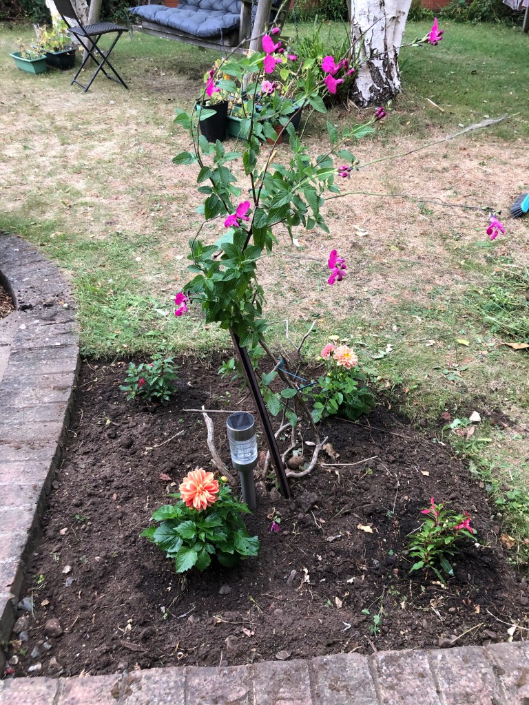 My youngest then helped me plant the dahlia’s that we bought a couple of days ago. We planted them around the salvia plant along with two fuchsia plants that were in another part of the garden.