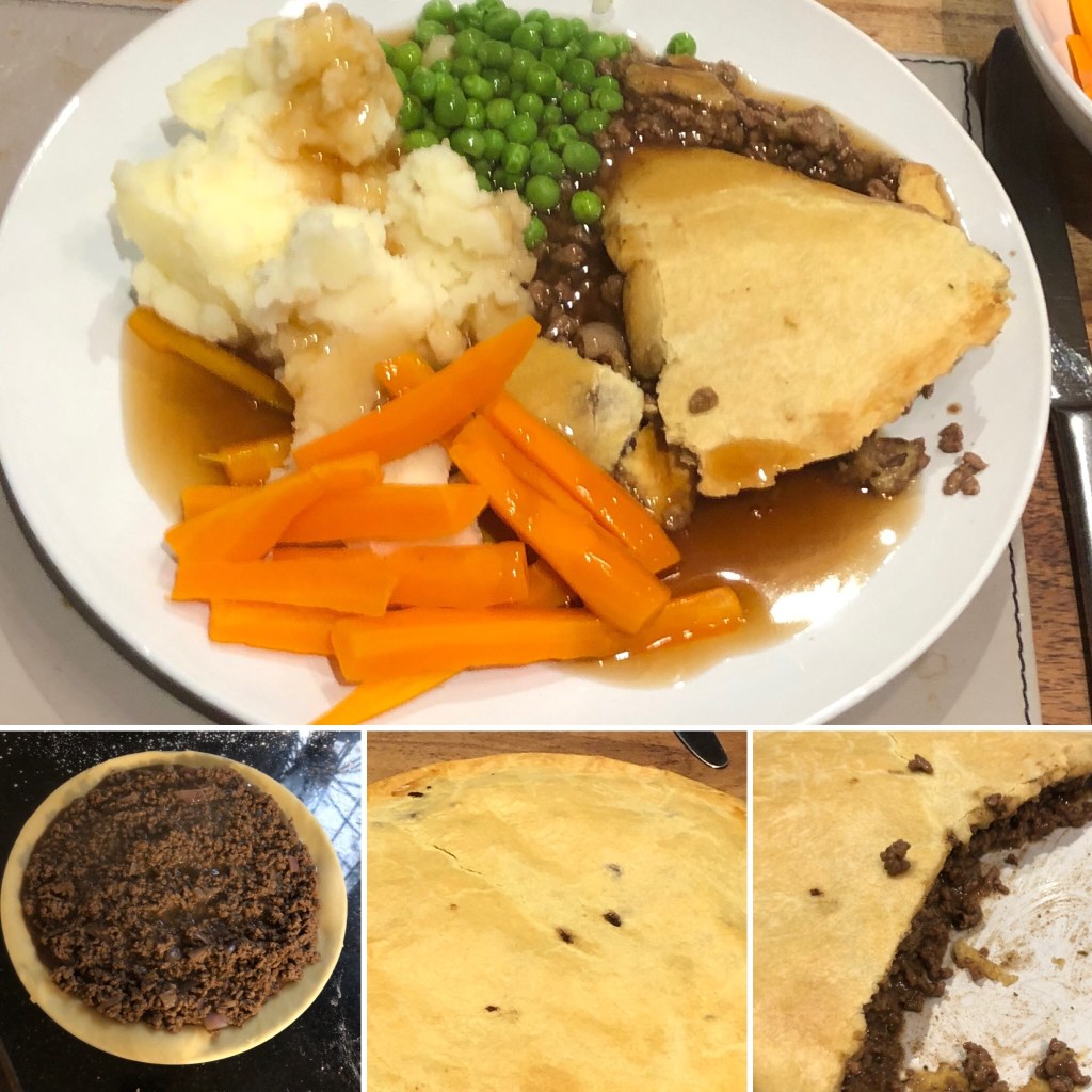 I eventually had to stop to cook dinner… home-made meat pie with mash and vegetables.