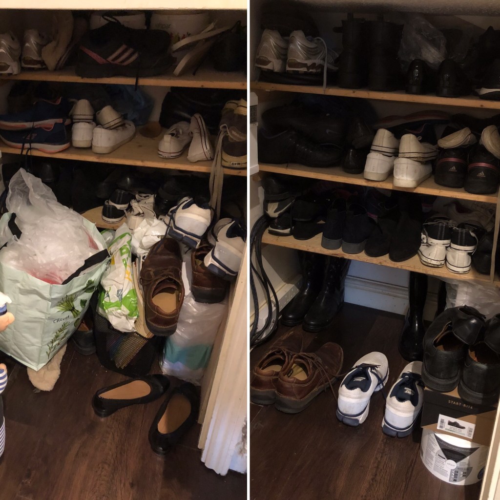 I moved out the stuff that shouldn’t have been in there and threw away a few old pairs of flip flops that had seen better days. I also thought about how I could make a bit more space in there by transferring the shoes that I’m not wearing at the moment (i.e. work shoes, holiday flip flops) to my wardrobe upstairs. I’d created a whole shelf for my shoes a couple of days ago so that worked out well and there’s still space.