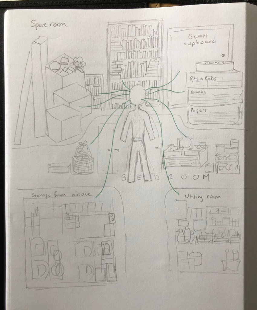 This morning during my usual me time, I sketched something that resembled the clutter that I’m attached to in my head.
