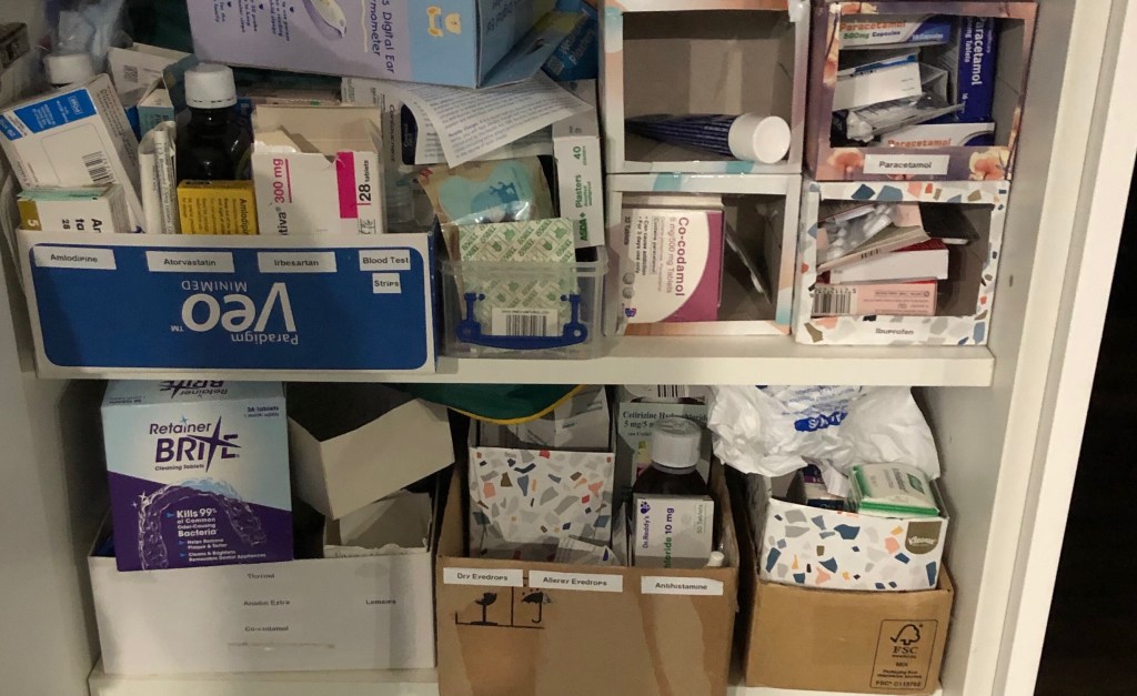 Many months ago I created labels for each type of tablet and although it seemed like a good idea at the time, it has been too difficult to maintain. I still get asked where the paracetamol is even though it clearly has a label. The problem is that things rarely get put back in the right place and I think that it includes me sometimes when I’m in a rush or the space is full! So, it was time for a change.