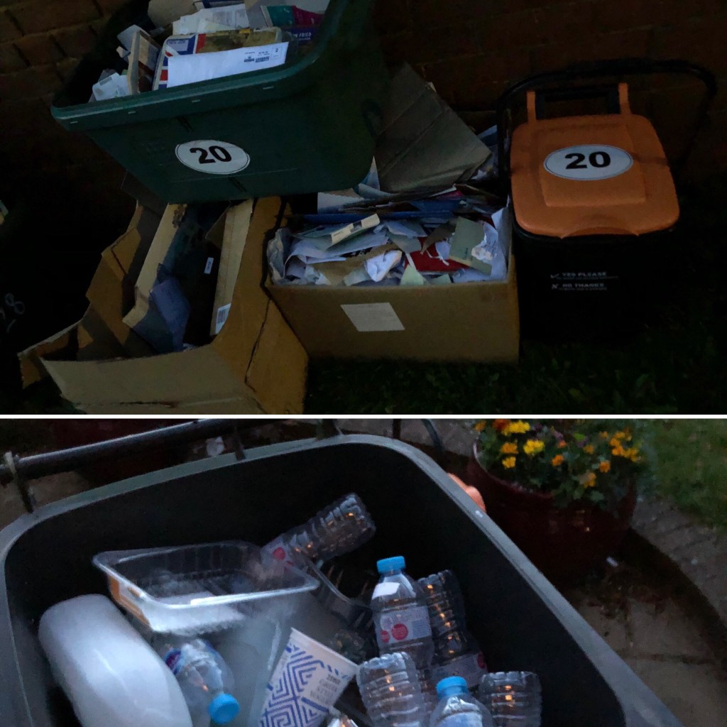 As I had prepared and stacked all the paper and cardboard recycling at the weekend, and I’ve been keeping on top of during the day, I only had to do one last look around the house before dragging the bins and boxes round the back.
