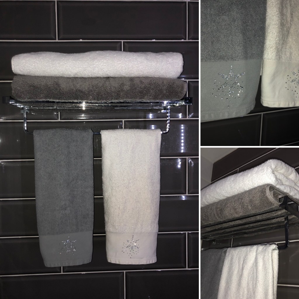 I used to hang clothes to dry on this chrome towel rail in the bathroom and then just leave them there instead of putting them in the girls’ wardrobes. Although it was a useful place to hang clothes, I wasn’t really making good use of the shelf. I decided today to actually use it for what’s it’s designed to be used for. I know it sounds like a simple change but it’s made the whole bathroom look clearer and less cluttered. It feels more like a bathroom again.