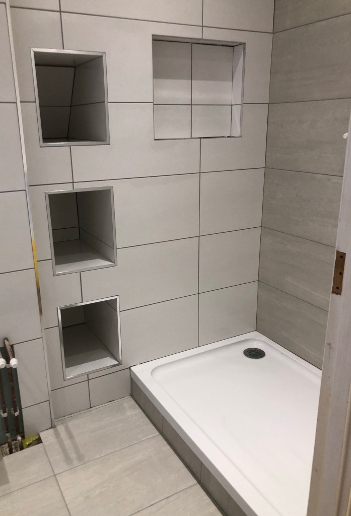 My first challenge that I was given this morning was to choose between a white grout and a gunmetal grey grout. The latter being easier maintenance apparently, so I’m all for that. My daughter and my husband were leaving the decision up to me so I chose gunmetal grey. He let me look at a couple of tiles first before he did the rest and I was happy. It looks amazing now he’s finished all of the grouting. The grey grout really brings the tiles alive.