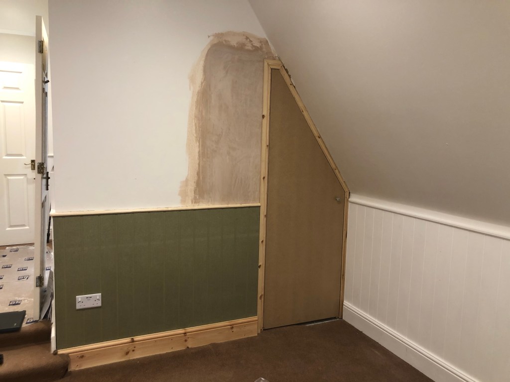 The carpenter turned up late afternoon to finish the cupboard, adding the frame and a hinged door. He also replaced the wood panelling so that it all matched along that wall.