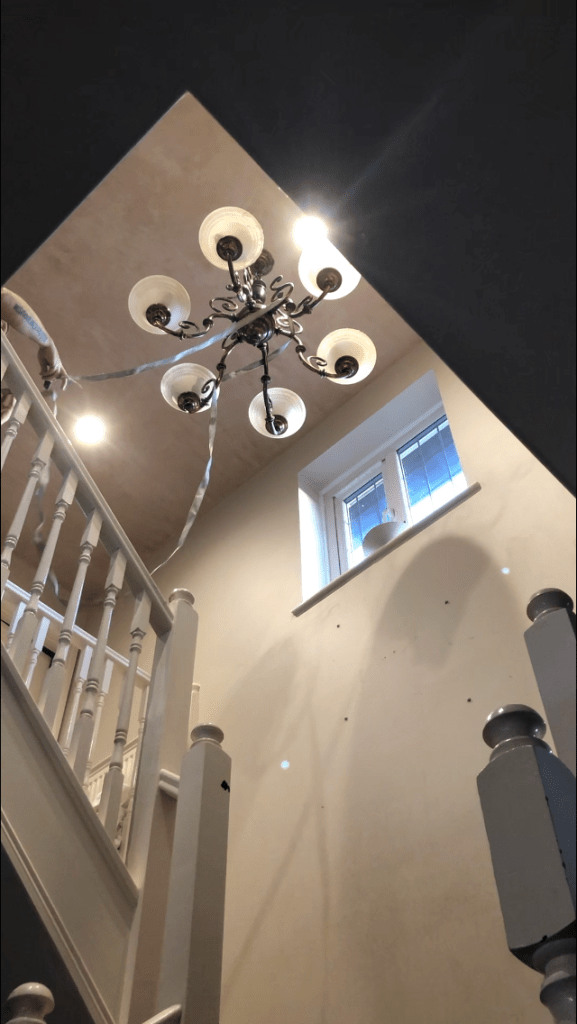 It wasn’t a nice job but we were lucky that the electrician had a lot of patience. It’s hard to get to from the landing as we have quite a open stairwell. That’s why I always avoided cleaning it as it was high up. We’ve just gone with spotlights for now. Maybe we’ll add something at a later date, that hangs down a bit lower and is easily accessible. Hallway looks bigger and brighter just with it not being there. Once it’s decorated as well, we won’t recognise it.