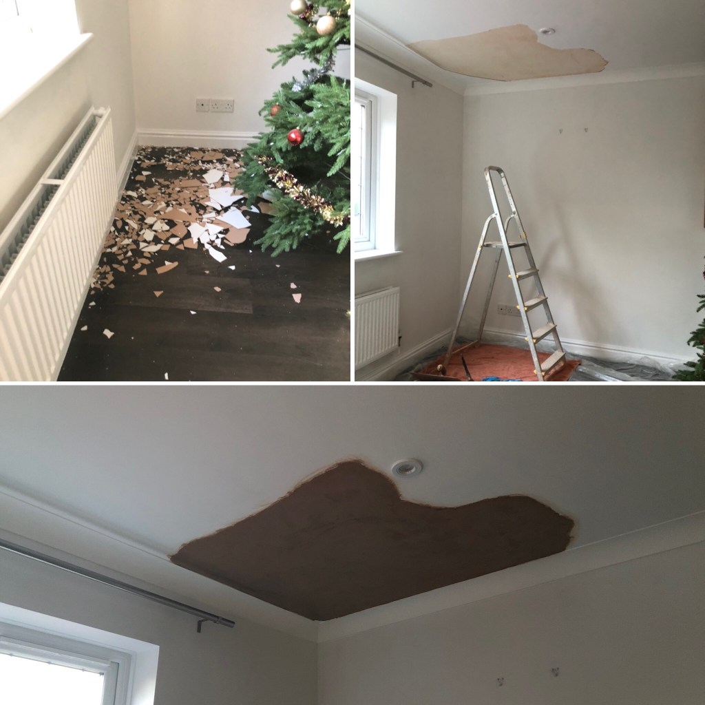 Our plasterer turned up early today to fix our ceiling. He said that the glue had probably dried out too quickly in that area before he plastered it. It didn’t help that he had to work around the Christmas tree in that corner last week (if you remember, I did say that the tree should come out 😊). The radiator is also below it which probably didn’t help. The weight of the paint then must have pulled the plaster off the ceiling in the night.
