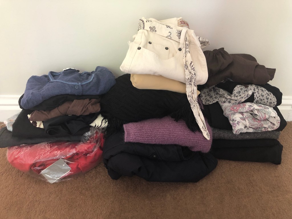 I was surprised at how quickly I was making decisions today. Clothes were being tossed in the charity bag pile without hesitation. This pile of clothes was the result of my efforts today. I’ve already booked a slot to give three more bags to charity next Friday, and these will fill one bag nicely.