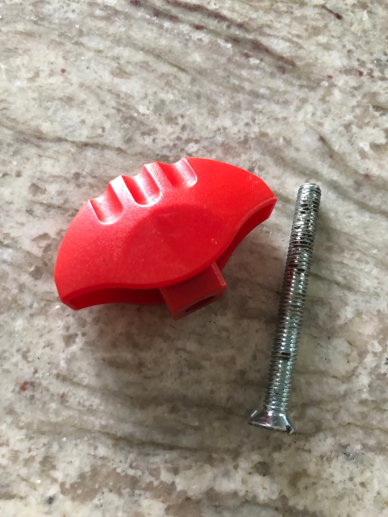 As I’m going to see them again tomorrow, and would have my daughters in the car, I knew that I would have to take the tape off the side of the mower in order to get the handle to fold over. So, I went into the garage to look for an appropriate screw to fix the handle on properly.