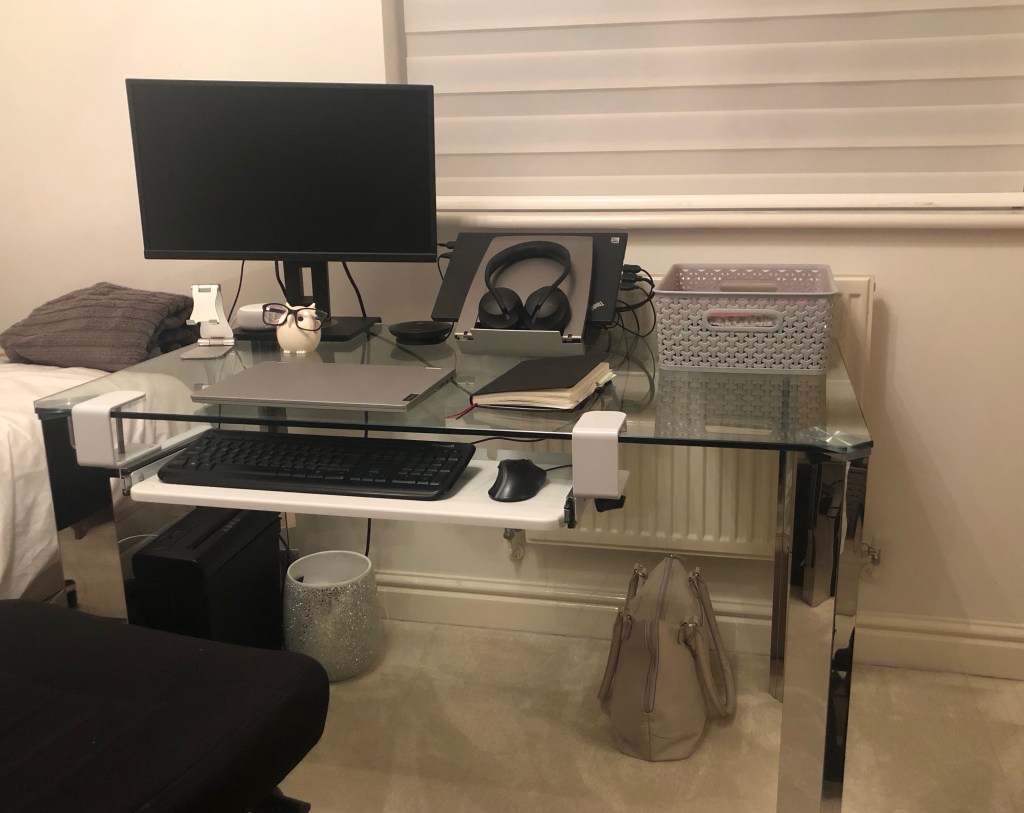 Just in front of that is my work desk which is now also tidy and organised (both the surface and underneath the desk). I achieved this by tackling things one by one and only putting back what I needed. One of the issues I had was the work keyboard being in the way when I want to write or do personal admin in the evenings. I’ve resolved this by adding a suspended shelf underneath so that my keyboard is out of the way from my personal laptop.
