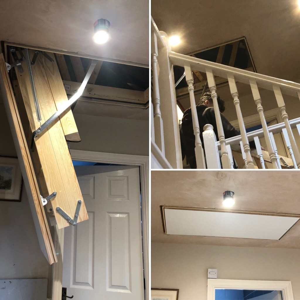 We had quite a bit of work done around the house today. First to arrive was the carpenter and his son to fit the loft hatch. We ended up with a new ladder as well quite by chance. All we were expecting was for him to make a hatch door as he’d already reattached our existing ladder to the hatch when he made the opening bigger back at the beginning of October. Then there was a delay with him coming back because of the second lockdown, and we had to make do with the temporary hatch until today.